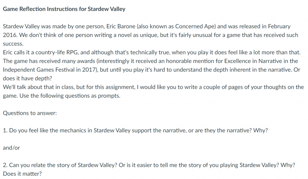 For me, I feel like the mechanics of Stardew Valley support the player’s story excellently, while the NPCs’ stories do not make a strong connection with the game mechanic.