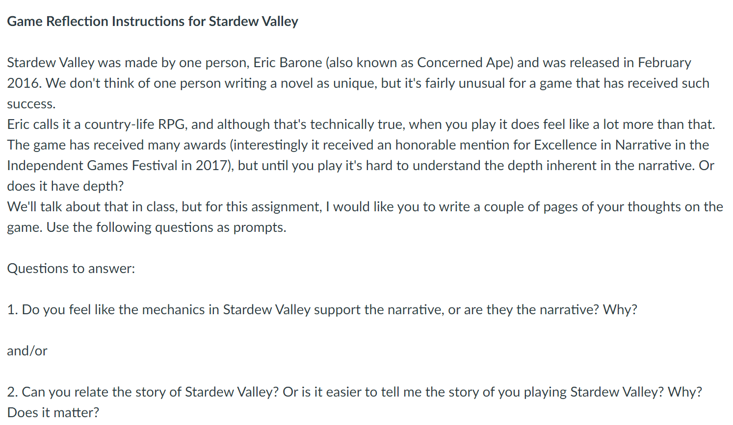 For me, I feel like the mechanics of Stardew Valley support the player’s story excellently, while the NPCs’ stories do not make a strong connection with the game mechanic.